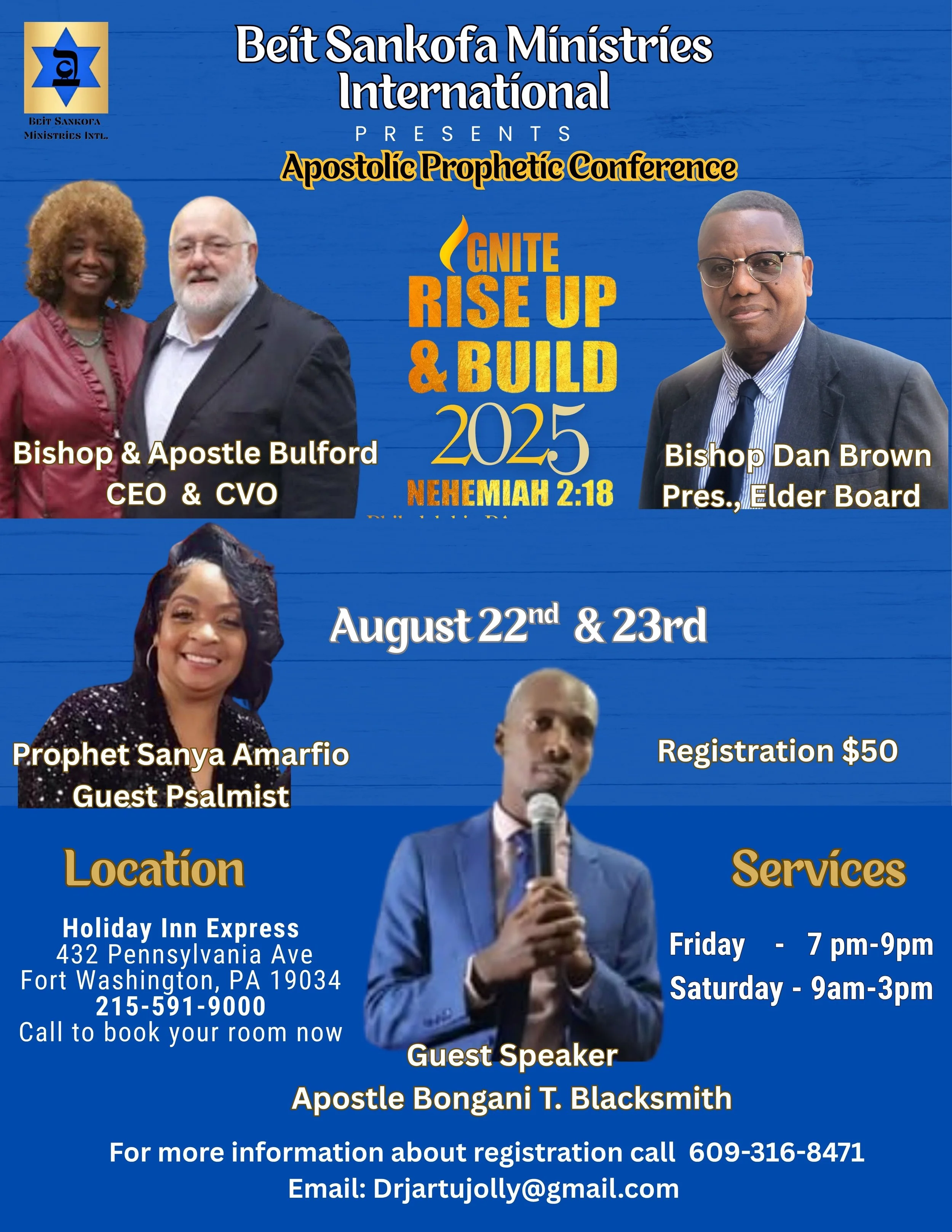 We warmly invite you to “Ignite, Rise Up & Build 2025,” an Apostolic Prophetic Conference rooted in Nehemiah 2:18, on August 22nd and 23rd located at the Holiday Inn Express at 432 Pennsylvania Ave, Fort Washington, PA.